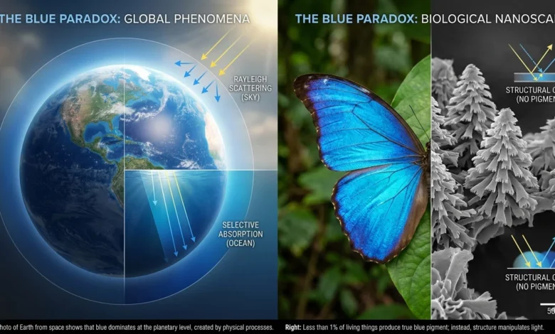 Regardez une photo de la Terre prise depuis l’espace. Tout est bleu. Le ciel, les océans, l’atmosphère : la planète entière baigne dans cette teinte. Pourtant, moins de 1 % des organismes vivants sont capables de fabriquer un véritable pigment bleu. Le paradoxe est saisissant. Le bleu domine le paysage à l’échelle planétaire, mais presque aucun être vivant ne le produit chimiquement. Alors d’où vient tout ce bleu ? La réponse tient dans un jeu subtil entre physique de la lumière, nanostructures et évolution, un jeu que la science commence tout juste à décoder.