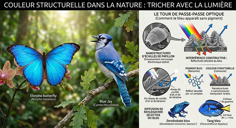 La raison ? Produire un pigment bleu exige une architecture moléculaire très particulière, que l’évolution n’a sélectionnée que dans une poignée de lignées. La grande majorité des bleus que l’on admire dans la nature sont des illusions d’optique : pas de la chimie, mais de la physique pure, créée par la structure même des tissus vivants.