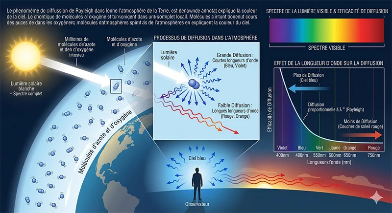 Le phénomène porte un nom : la diffusion de Rayleigh. Quand la lumière du soleil pénètre dans l’atmosphère, elle rencontre des milliards de molécules d’azote et d’oxygène. Ces molécules diffusent la lumière, mais pas de manière uniforme. Les courtes longueurs d’onde, celles du bleu et du violet, sont diffusées bien plus efficacement que les longues longueurs d’onde rouge et orange.